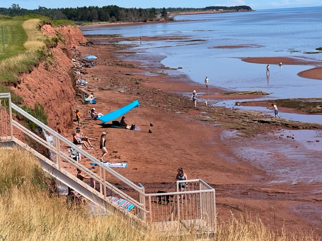 We next visited Argyle Beach on the Northumberland Strait side of the island. Notice the rich, red sand so visible at low tide. A swim here revealed again that the water on the side of the Straight is noticeably warmer than the ocean side, though both are comfortable for a swim – significantly warmer than the water along the coast of Maine; I don’t know why, but maybe I can find out and put it in a future blog.