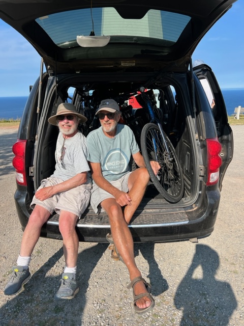 In another of the remarkable encounters with the incredibly friendly and generous people in the Canadian Maritimes, we met local resident William on the docks while he was walking his dogs. We had been talking about making the long uphill walk or bike ride to a lighthouse high on a hill overlooking the ocean when William insisted that it would take too long as it was already late afternoon; he insisted that he would drive us and our bikes up to the lighthouse and we could ride the bikes downhill back to the harbor. Despite our skepticism, he successfully squeezed 5 bikes and 5 of us into his Dodge Caravan; it was not the safest ride I’ve ever taken – Jim and I drew the short straw, and held on for dear life: