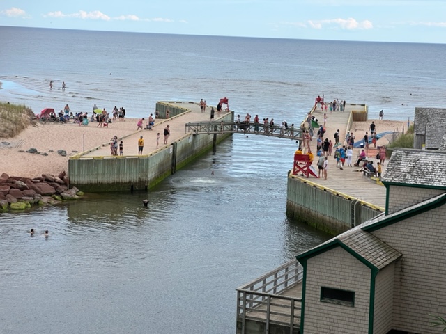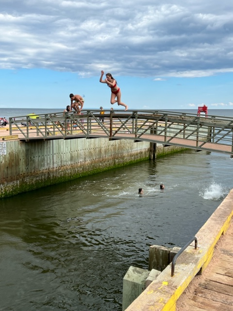 After our visit and swim at Greenwich Beach, we stopped at another unique place called Singing Beach – it got its name because the sand, due to its high silicon content, is supposed to squeak – or “sing” – as you walk on it when it’s hot and dry. Try as I might, I couldn’t get the sand to sing to me – maybe because I was born totally devoid of musical talent, even being graciously escorted in sixth grade out of mandatory Chorus class to an extra study hall period so that my attempt at singing didn’t disrupt the Chorus class. However, at Singing Beach, I enjoyed watching the young people jumping into an old canal lock and riding the outgoing tide into the Atlantic!