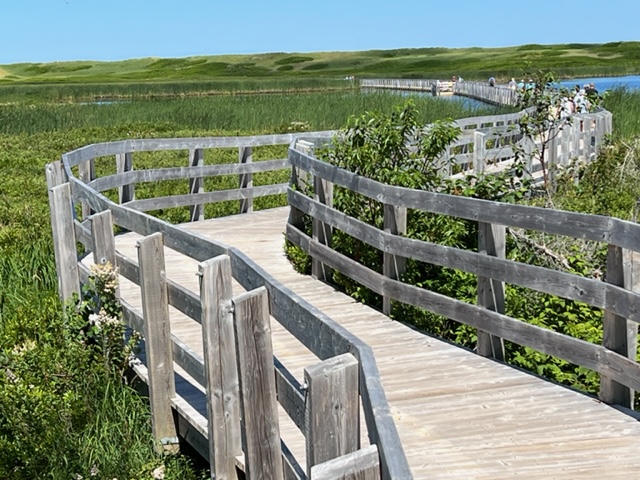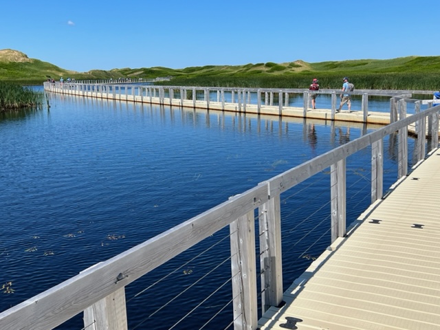 We then visited Greenwich Beach, one of the most stunning on the island, both for the beach itself with its large Cape Cod-style sand dunes, and for the amazing access to the beach. The sand was beautiful, the water cool and refreshing but not cold, as we all went in for a swim. Here is the incredible accessway to the dunes and the beach. The walkway starts out on piers above the wetland vegetation, but changes to a floating walkway when it reaches a pond to be crossed: