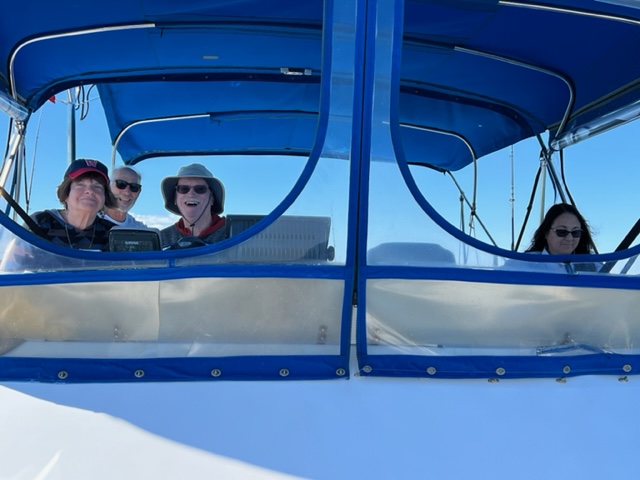 Since Jake, Elissa, and Audrey joined us for the voyage from Summerside to Charlottetown, I couldn’t resist posting these two images with Jake at the helm, flanked by Elissa on the left and Audrey on the right: