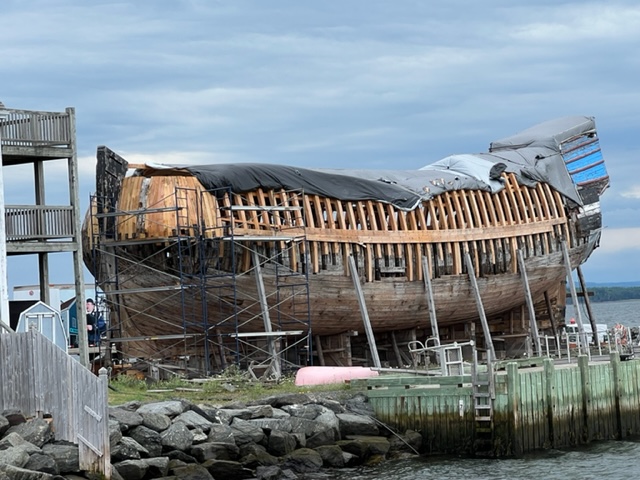 One of the main historic attractions in Pictou is the Hector Heritage Quay Museum and the story of the ship Hector, including a full size replica which is currently being rebuilt at the museum. The original Hector brought the first wave of emigrants to Nova Scotia from Scotland in 1773. It was an arduous trip that took 11 weeks, due in part to the age of the ship and a gale off the coast of Newfoundland; during the trip, 18 of the 189 passengers died of dysentery and small pox. The replica was launched in 2000, but reportedly due to insufficient funding and neglect by the government, the ship fell into disrepair and is now being rebuilt by the non-profit organization that runs the museum. Here is an image of the current state of the reconstruction: