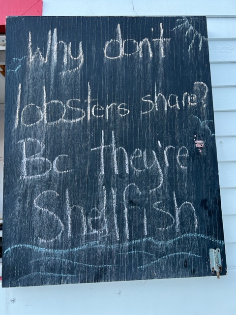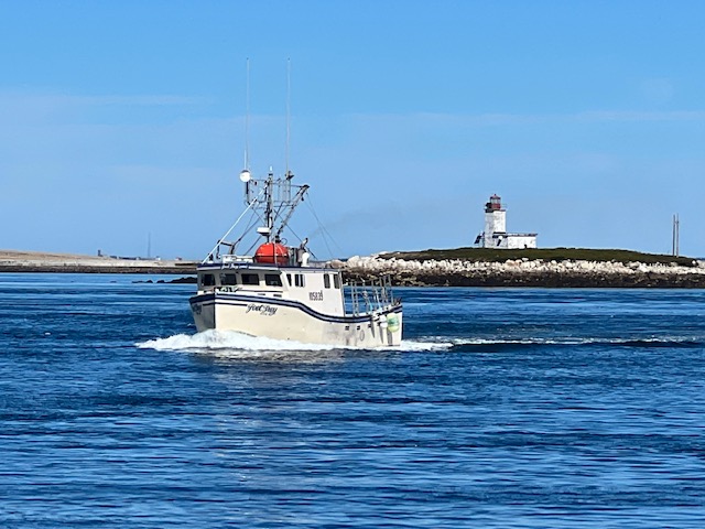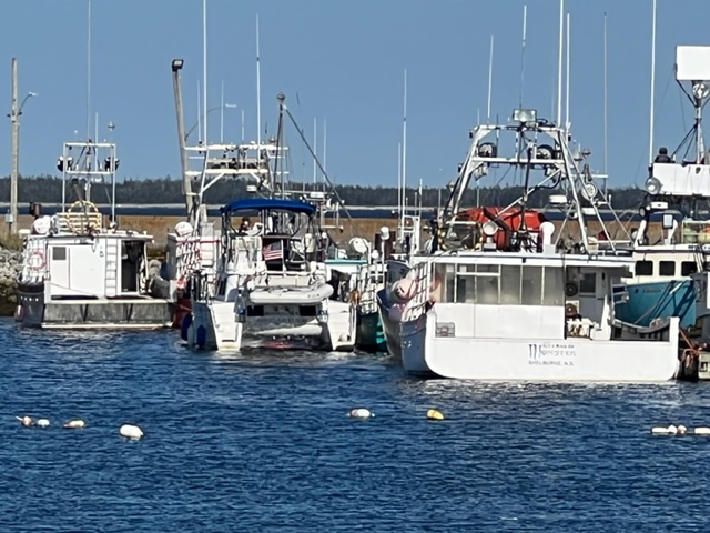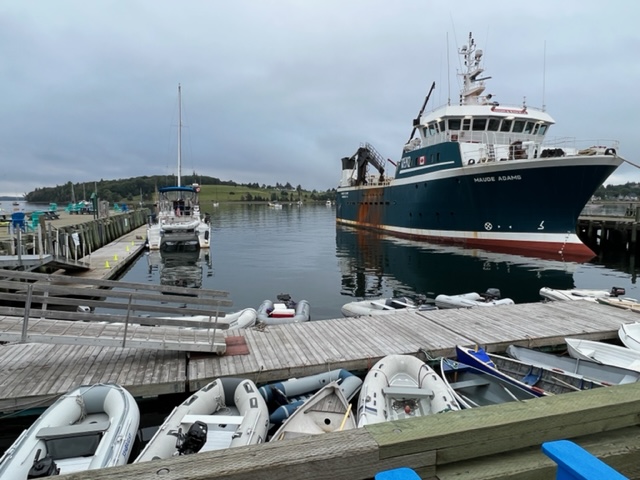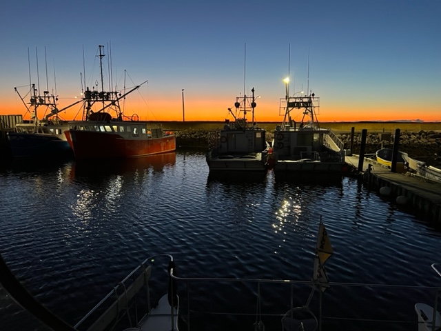 I’m starting to worry that the Joint Adventure might be having an identity crisis. At her home port on the Charles River in Cambridge, she is surrounded by only power boats, so she feels very much at home. Cruising New England waters, she encounters many sailboats, so she understands them and is OK with them around. But ever since we headed east from Quebec City, harbor after harbor, she’s surrounded by nothing but fishing boats, mostly large, muscular fishing boats, so I think she might be starting to question her identity….