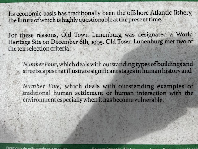 Exploring Lunenburg, I quickly discovered that it contains the steepest streets that I’ve ever encountered – noticeably steeper than in San Francisco, although the steep sections aren’t as long. The following two plaques explain why better than I could: