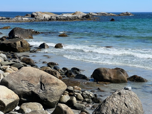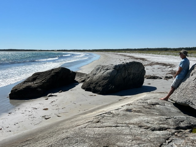 We next arrived at Crow’s Neck Beach, which we were told is one of the prettiest beaches in Nova Scotia. It turned out to be a hidden gem – so remote that it’s mostly empty, as it was the beautiful sunny afternoon when we visited. The sand is as fine and smooth as we’ve seen anywhere (except the white flour-sand of Fort Myers Beach). We walked the entire length of the mile-long beach, our feet in the quite-cold water; no longer the warmer waters of Prince Edward Island, Bras d’Or Lakes, or Eastern Nova Scotia: