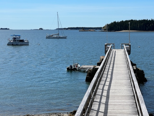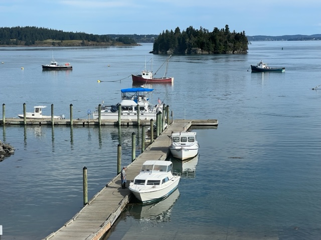 The cove is fully protected by an island across the entrance, and is quite active. There is no town per se nearby, but there is a classic New England General Store and an adjacent restaurant a short walk down the road. Unfortunately, the restaurant was closed for the season due to staffing shortages. However, Jim and Paul decided to relax on the porch of the General Store with a coffee: