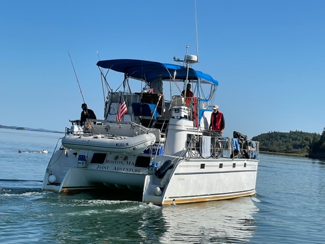 Since we returned to US waters, a major challenge has been the proliferation of lobster traps. The lobster fishery in Canada runs from November through July 1, so by the time we got to the lobster grounds in Canada, all of the traps had been pulled for the season. However, in the US, the season goes through the summer and fall, so in northern Maine, there are lobster traps EVERYWHERE! Piloting among them take constant vigilance, and we have the helmsman and at least one other person on the bridge at all times when underway to watch for the floats which are attached to the traps. Spotting them is hard enough when there are waves or chop, and/or the sun is reflecting on the water ahead; however, the biggest danger is from traps in which the floats are submerged as they get pulled underwater by the swift current or perhaps just by high tide if the line isn’t long enough. At one point, three of us on the bridge failed to spot a submerged float until it was too late to maneuver around it or stop; fortunately, it passed harmlessly between the two pontoons without getting caught is a propeller.