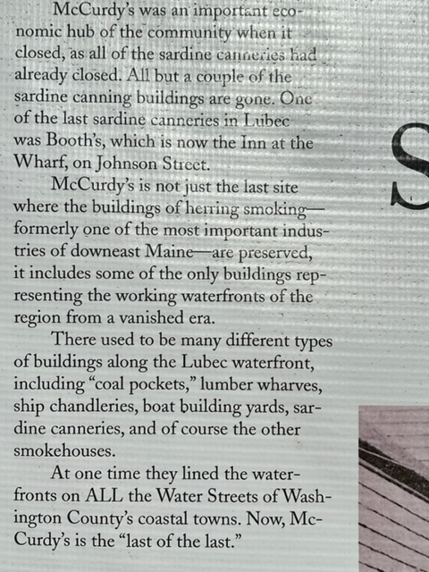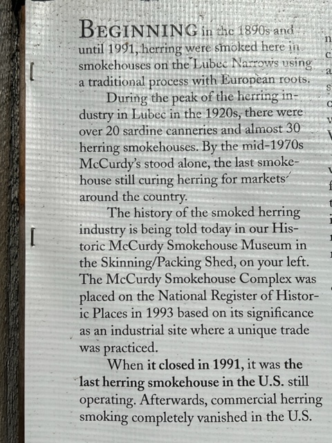 Of all the amazing museums we visited throughout our trip, perhaps the most fascinating was the small but extraordinary McCurdy Smokehouse Museum in Lubec. The following plaque provides an overview of the magnitude of the sardine and smoked herring operations in Lubec in the late 1800’s and the first half of the 1900’s: