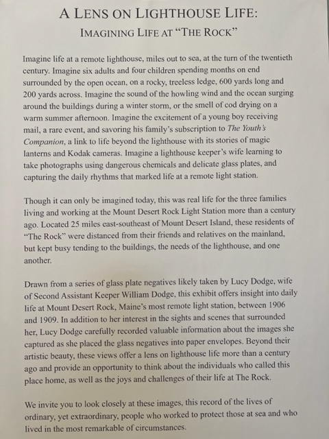 The other exhibit that caught my attention told the story of Mount Desert Rock Lighthouse. Mount Desert Rock is just that – a barren rock outcropping 18 miles out to sea from Mt. Desert Island. The first lighthouse was built on the rock in 1830, and the current one was built in 1847. However, in the early 1900’s, the lighthouse was deemed important enough to be manned year-round. Two houses were built, one with two living units and the other with one. For three years from 1906 to 1909, three families – six adults and four children – lived on the island year-round as caretakers. Here is a brief summary of the story: