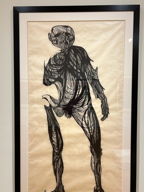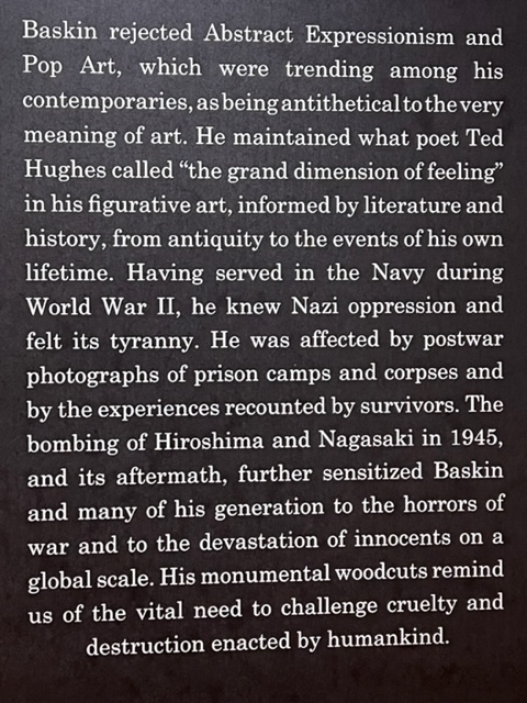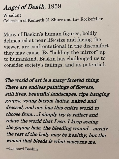 The most compelling exhibit was the works of an artist named Leonard Baskin, whom I had never heard of but learned about in this exhibit. He was an American sculptor and artist who was born in 1922 and died in Northampton, Ma. in 2000. Baskin abhorred the violence, and some of his artwork sought to convey the horrors of war and man’s inhumanity to his fellow man. Later in his career, he created a series of “woodcuts” called the Holocaust Series to focus attention on such horrors. These works are graphic, and I found the exhibit to be quite compelling. Here are some images from the exhibit: