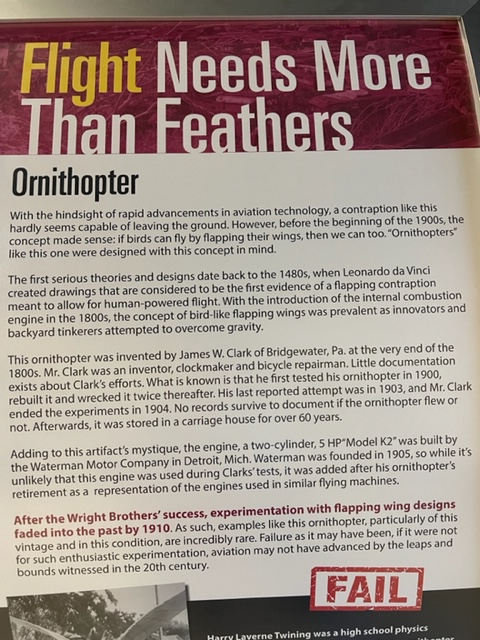 Before the Wright Brothers and others demonstrated the feasibility of powered flight using fixed wings, experimentation with machines with wings that flapped was also being done. The museum contains one of the very few remaining such machines. The wings are literally bird feathers, each of which is painstakingly attached individually to the frame of the wings: