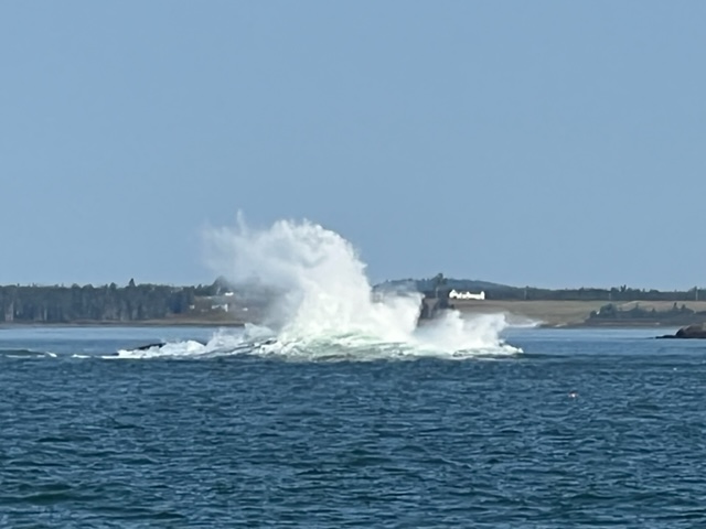 Our next run was 25 miles to Jonesport, Maine. We were experiencing swells of 5′-6′ from the remnants of Hurrican Earl well offshore; the swells were not steep, so they posed no danger except possibly when entering harbors or unprotected narrow passages, but they provided some eye-catching scenery: