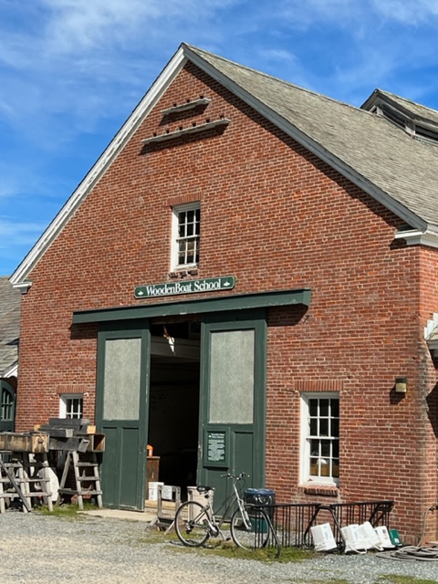 On our way to Buck’s Harbor, we picked up a mooring to visit the WoodenBoat School, which was started in 1981 as an extension of WoodenBoat Magazine. According to their Mission Statement, the purpose of the WoodenBoat School is “to provide access to experience for WoodenBoat enthusiasts in construction, maintenance, repair, design, seamanship, and other related crafts, and to establish a meeting ground for the finest and most knowledgeable boating professionals to share their skills, techniques, and appreciation of craftsmanship in wooden boats.” We took our dinghy into the dock, and were welcome to wander around the campus. Here is an image of the beautiful cove in which the WoodenBoat School is located, including the Joint Adventure at their mooring and their substantial dock: